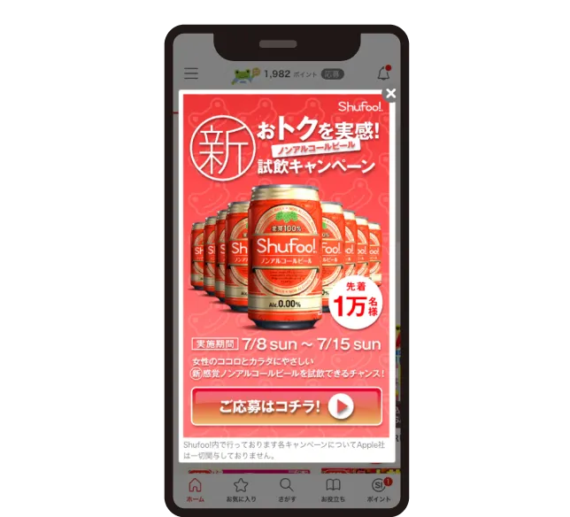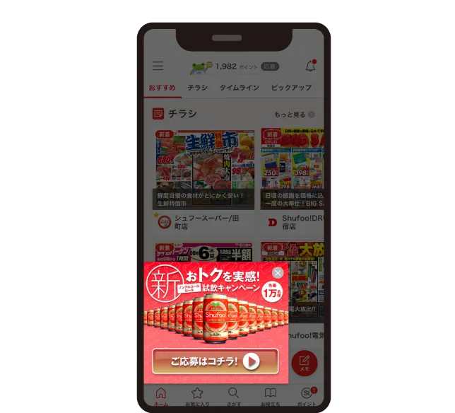 プレミアムパネルShufoo!アプリ起動時の全画面広告で、買いもの計画中の生活者へ確実にリーチ。商品認知など、インパクトのある訴求が可能なメニューです。