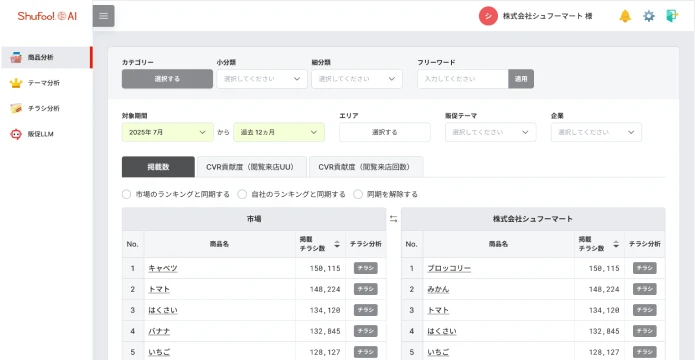 各商品の全国/エリア/企業ごとでのチラシ掲載状況や、掲載時期のトレンド・価格推移を調べることができます。また一緒に掲載される商品も可視化できます。