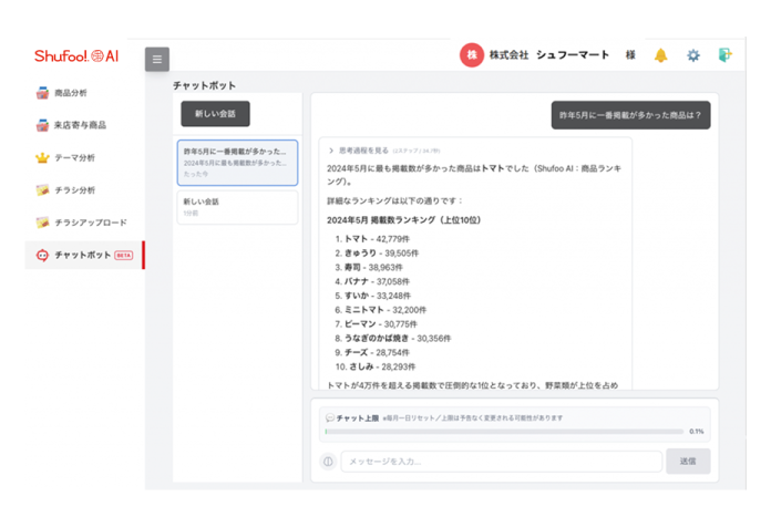 直感的に使用できるメッセージタイプのUIを使い、質問を投げかけることができます。質問に対してShufoo! AIがデータに基づいた分析結果/企画立案のサポートをいたします。