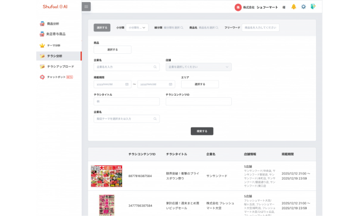 商品やテーマから、該当するチラシを検索することができます。「どのようなレイアウト」「どんなキャッチコピー」で訴求が行われているのか、を直感的に把握することができます。
