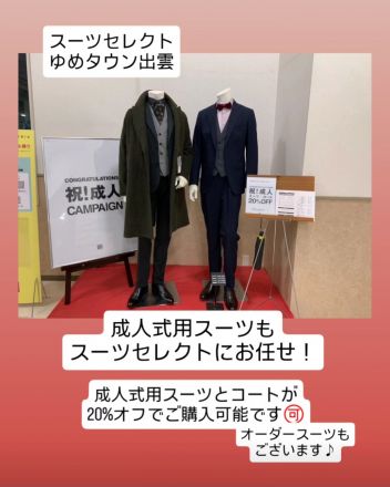 成人式用スーツは20%オフ!! 2026年ご成人を迎える新成人の皆様、おめでとう…