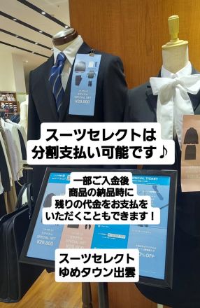 一部入金支払い可能です♪スーツセレク… スーツセレクトゆめタウン出雲では、 思いがけ…