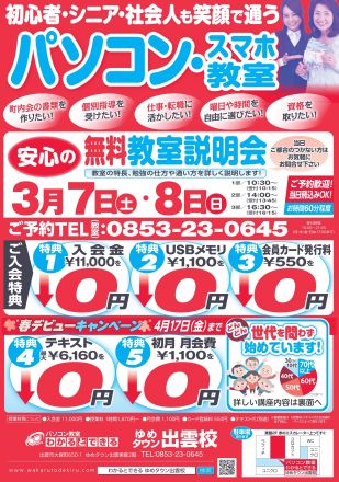 3月7・8日 無料教室説明会開催 パソコン教室わかるとできる出雲校では、 下… 2日前