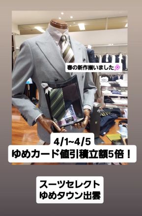 4/1~4/5ゆめカード値引積立額5倍! スーツセレクトゆめタウン出雲では4/1~4/5 ゆ… 3日前