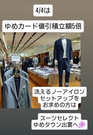 ゆめカード値引積立額が5倍スーツセレ… スーツセレクトゆめタウン出雲では4/4ゆめカー… 10時間前