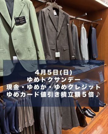 【SUIT SELECT】4月5日(日)ゆめトクサ… 4月5日(日)はゆめトクサンデーです♪ 現金・ゆ… 33分前