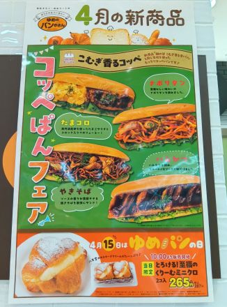 いつもユアーズ宮内店をご利用いただきありがとうございます。 本日は、「ゆめのパンやさん」から、4月の新商品をご案内します。 4月は、こむぎ香るもっちりコッペパンを使って「コッペぱんフェア」開催です!(゚∀゚)  ・奥丹波産卵を使ったたまごサラダと   コロッケ入りでボリューミー   こむぎ香るコッペ(たまコロ)250円  ・懐かしい味わいのナポリタンを挟んだ   こむぎ香るコッペ(ナポリタン)280円  ・ソースの香りが食欲そそる   こむぎ香るコッペ(やきそば)250円  ・ハムカツを挟みフルーティーなソース   で味付けした   こむぎ香るコッペ(ハムかつ)250円 ポリュームがあり食べごたえ十分な一品です!(^^)! ※金額はすべて本体価格です。 この機会にぜひご利用ください。 品切れの際はご容赦ください。