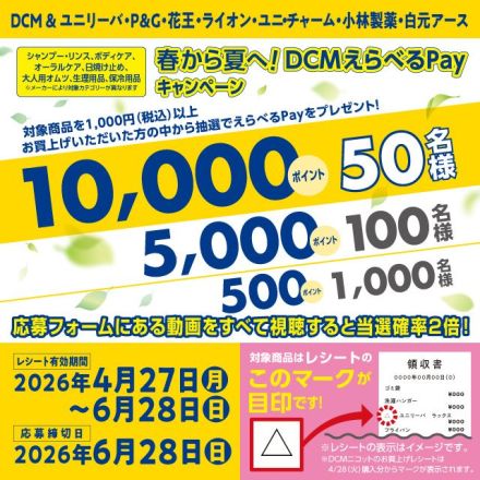 春から夏へ!DCMえらべるPayキャンペー… (シャンプー・リンス、ボディケア、オーラルケ… 5分前