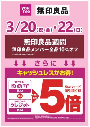 【専門店】1F 無印良品より、ゆめタウ… 3/20(金)より無印良品週間開催! 期間中無印… 19時間前