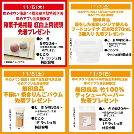 【専門店】11/6(木)〜9(日) 4日間… 【専門店】ゆめタウン徳島14周年創業祭がスター… 1日前