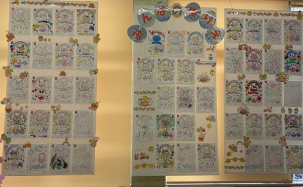 ぬりえの募集してた作品を青果側入口にて展示中です♪ たくさんの作品ありがとうございました♪