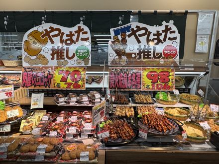 惣菜コーナーにて、焼き鳥や芋テンやコロッケなど、各種売りで販売しております。 やはた推しです♪ ぜひ、お買い求めくださいませ。
