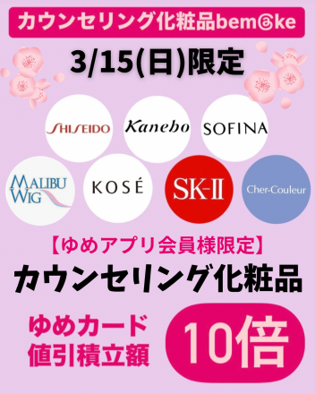 アプリ会員様限定!カウンセリング化粧… 1階カウンセリング化粧品bem@keより 3/1… 11時間前