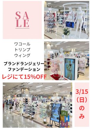 3/15(日) ブランドランジェリーファ… 3/15(日)限定! ワコール、トリンプ、ウィ… 1日前