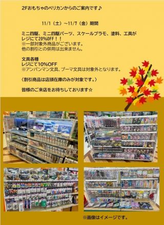 2Fおもちゃのペリカンからのご案内です… 11/1(土)~11/7(金)期間 ミニ四駆、ミニ四…