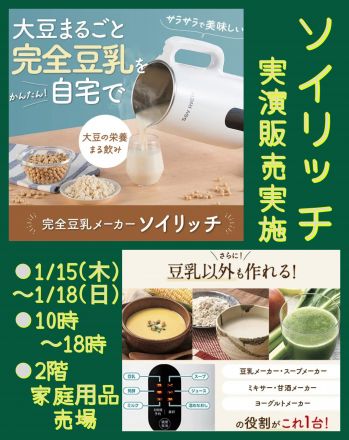 豆乳メーカー「ソイリッチ」実演販売実… こんにちは(^-^)v いつもゆめタウン大牟田をご… 20時間前