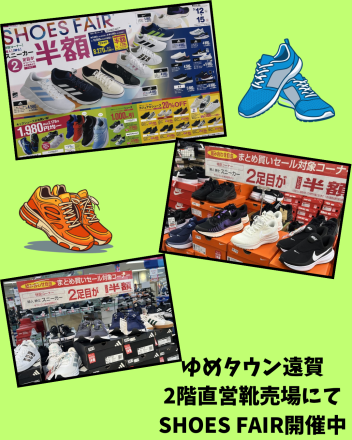 こんにちは♪ゆめタウン遠賀店 2階フロア 靴売場よりご案内です(*^^*) 皆様お待ちかねの半期に1度のSHOES FAIRが遂に始まりました!! メンズ・レディーススニーカー2足目レジにて 半額企画(お値段のお安い方が半額になります) や、婦人靴、紳士靴、子供靴特設コーナー レジにて20%OFFなどなど、お得な企画が 盛り沢山となっております☆ ※期間は3月12日(木)~3月15日(日)までと なっております。 春のお花見やお出かけに新しい靴を履いて お出かけされてみてはいかがでしょうか(*^^*) ぜひこの機会にゆめタウン遠賀 2階直営靴売場 まで起こし下さいませ♪ 皆様のお越しをスタッフ一同 心よりお待ちしております(*^^*)