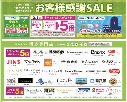 3/5〜3/8日 感謝の4日間ゆめカード5倍 ゆめタウン博多専門店 対象のお店でゆめカー… 2日前