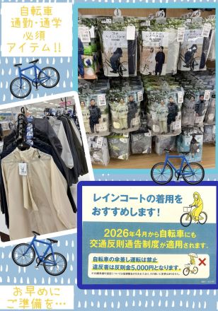 自転車利用の方はぜひご準備を 1階服飾売場内シーズン小物コーナーより ご案… 3日前