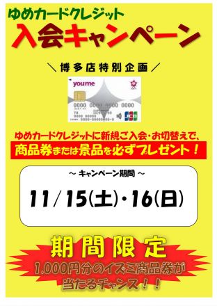 ゆめクレジット入会キャンペーンのお知… ★ゆめタウン博多店限定★ 【イズミ商品券が当… 8時間前