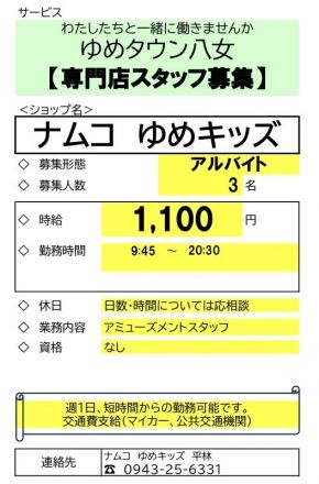 ★ナムコスタッフ募集のお知らせ★ 【スタッフ募集のお知らせ】 ゆめタウン八女…