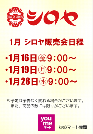 1月のシロヤ販売スケジュール あけましておめでとうございます。 今年もゆめ…