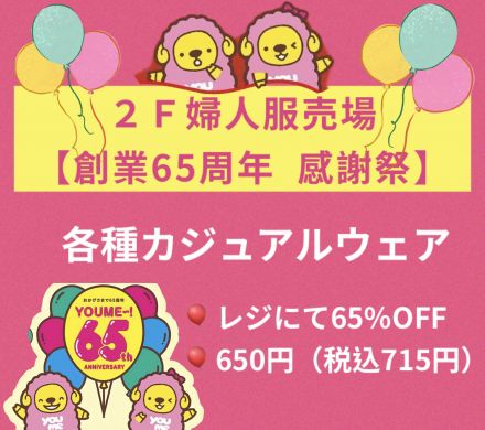 創業65周年 感謝祭のご案内【婦人服売… 2F直営婦人服売場より イズミ創業65周年!感… 21時間前