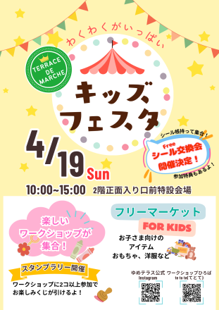 4月19日キッズフェスタ開催 4月19日(日) 10時~15時 2階正面入り口前特設… 15時間前
