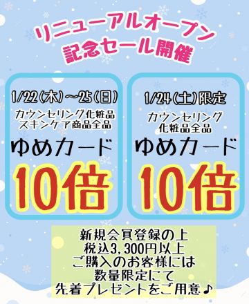 22日より化粧品コーナーリニューアルオ… 1階カウンセリング化粧品be m@keより お得なセ… 3日前