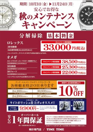 ★秋のメンテナンスキャンペーンのお知… 1階時計店 タイムタイムです(^^) 今秋…