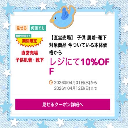 見せるクーポン配信中です♪ 2階子供肌着・くつ下売り場よりお知らせです♪ … 2日前