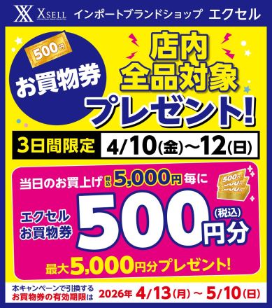 4/10(金)〜12(日) 〜3日間限定 お… 2Fインポートブランドショップエクセルよりご案… 1日前