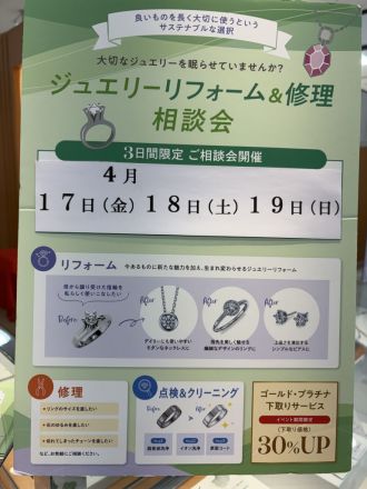 リフォームフェア開催します! 思い出のジュエリー 眠らせていませんか? … 11時間前