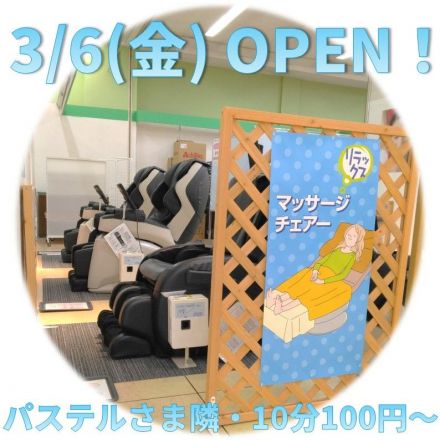 いつもご来店ありがとうございます 本日3/6(金)、パステルさまのお隣に、 マッサージチェアコーナーがオープンしました! お買物の合間に、ゆったりリフレッシュしませんか? 心もからだもほぐれる癒し空間をぜひご体感ください♪