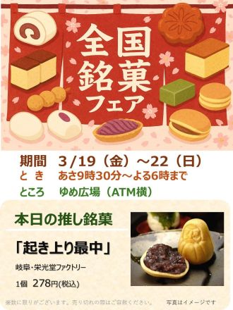 いつもご来店ありがとうございます 全国のおいしい銘菓が大集合する「全国銘菓フェア」! 3/19(金)~22(日)、ゆめ広場(ATM横)で開催します。 ♪ 開催まで毎日、推し銘菓をご案内します ♪ 本日の推しは、岐阜・栄光堂ファクトリーの「起き上り最中」。 数量限定ですので、お見逃しなく… ご来店お待ちしております♪