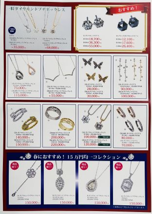 こんにちは♪ 本館1階 宝飾のリエジュからのお知らせです。 4月4日(土)・5日(日)・6日(月)の3日間 『ダイヤモンドフェア』を実施いたします。 お買得商品を多数ご用意いたしておりますので、この機会にぜひご来店くださいませ。 お待ちいたしております(*^_^*) ★期間中値引積立額5倍★