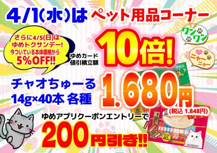 ☆4/1(水)ペット用品コーナーゆめカード値引積立額10倍!