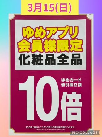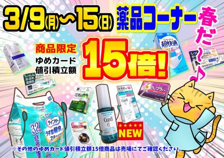 商品限定【15倍】おしらせ!3/15(日)は… こんにちは♪ ゆめタウン蔵王 薬品売場よりゆ…