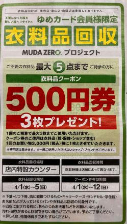 衣料品引き取りセール開催中! ゆめタウン久世店ではクーポン券がもらえる衣料… 3日前