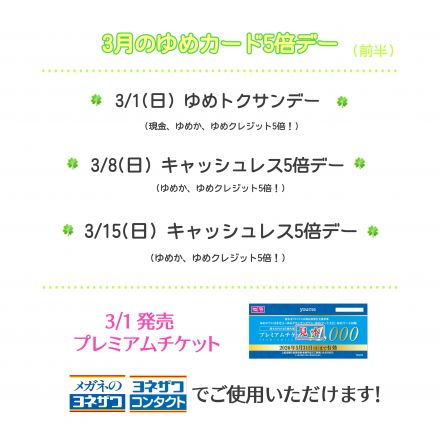 ヨネザワより3月のゆめカード5倍デーの… 1階メガネのヨネザワ、ヨネザワコンタクトより3…