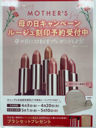 母の日に口紅をプレゼントしよう♪キス… こんにちは(o^^o) 化粧品コーナーより無料刻印… 19時間前