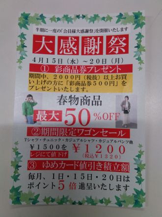 こんにちは! いつもゆめマート城山店をご利用頂き誠にありがとうございます☆ "彩フレンド"よりお得なご案内です 4月15日(水)~20日(月) なんと半期に一度の!大感謝祭を開催致します!\(^o^)/ ①彩商品券プレゼント  期間中、税抜2000円以上お買上げのお客様に彩商品券500円を  プレゼント ②期間限定ワゴンセール  1500円の商品→1200円に値下げ ③毎月1日15日20日は、ゆめカード値引積立額5倍! その他にも春物商品最大50%オフ! など大変お買得ですよ~♪ この機会にぜひ!ゆめマート城山店"彩フレンド"までお立ち寄りくださいませ。 ご来店を心よりお待ちしております(^^)