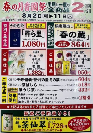 いつもゆめマート城山 ご利用いただき誠にありがとうございます♪ 月香園よりお知らせです(^^) 3月2日(月)~3月11日(水)の期間、 春の月香園祭を開催いたします☆ 全商品(お菓子、一部のお茶対象外あり) なんと2割引です!! また他にも数量限定で お買い商品多数取り揃えております♪ この機会にぜひ、 月香園お立ち寄りくださいませ(*^_^*) 皆様のご来店お待ちしております♪