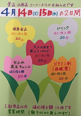 いつも ゆめマート八代高田をご利用 いただきまして ありがとうございます。 4月14日(火)・15日(水)の2日間 薬品・化粧品コーナーより 値引積立額 20倍の お買得セールのご案内です。 たいへんお買得となっておりますので 是非 ご来店ご利用くださいませ。