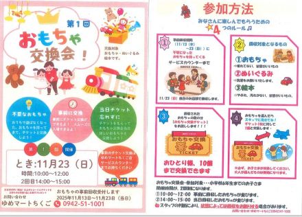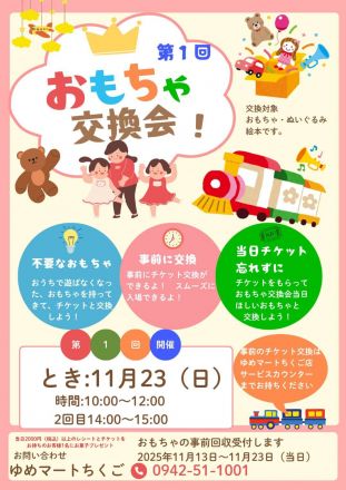 おもちゃ交換会のお知らせ 『ゆめマート筑後店限定 おもちゃ交換会』 い… 9時間前