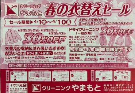 春の衣替えセール 1階 山本クリーニングより 「春の衣替えセ… 4日前