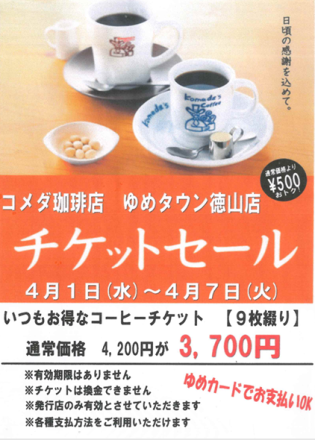 コメダのチケットセール 1階 コメダ珈琲店より チケットセール開催… 4日前