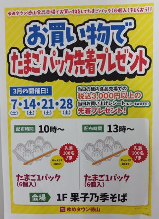 ★土曜日玉子プレゼント企画のご案内★ ゆめタウン徳山食品売場でお買い物をして た… 2日前