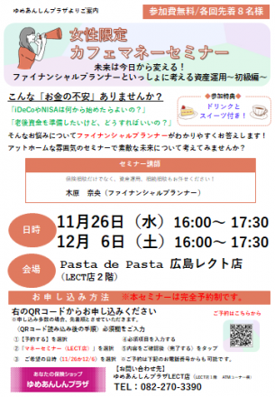 【1F ゆめあんしんプラザ】女性限定カ… LECTの保険ショップ ゆめあんしんプラザから … 6日前