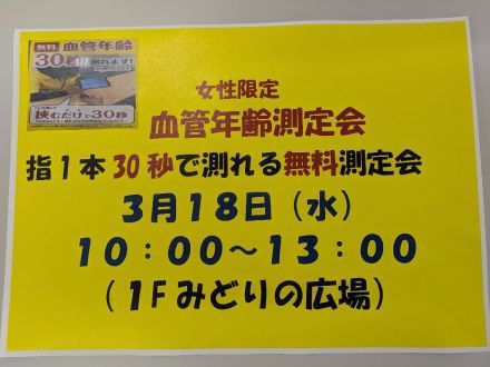 血管年齢測定会やります。 ※女性限定 とき:3/18水 10:00~13:00 場所:一階緑の広場 指一本30秒で測れる無料測定会です。 是非ご参加くださいませ。